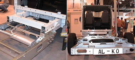 Auch für den VW T5 hat AL-KO jetzt ein passendes amc-Chassis im Programm. Es erhöht das zulässige Gesamtgewicht von 3.000 auf 3.500 kg und verlängert den Radstand. Die Rahmenabsenkung beträgt bei Montage hinter dem Kraftstofftank 141 mm.
