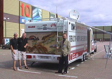 Dänische Caravan-Expedition machte in Düsseldorf Halt (Foto:Richter)(hr) Am vierten Tag ihrer großen Wohnwagen-Expedition zwischen Nordkap und Gibraltar machten der dänische Reisepublizist Peer Neslein und sein Partner Jann Nielsen gestern in Düsseldorf Station. Bereits vorgestern abend trafen sie auf dem Messe-Stellplatz am Caravan-Center ein. Den gestrigen Vormittag verbrachten sie mit ihrem Gespann auf dem Caravan Salon vor der Halle 9, wo sie den Deutschland-Importeur für Kabe, Wohnwagen-Stumpf aus Celle, besuchten.